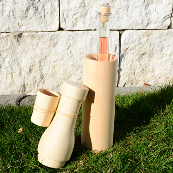 Als Geschenk oder als dekoratives Versteck für die eigene Schnapsflasche: Ausgehöhlte Flaschenform aus Zirbenholz, angepasst an die versteckte Flasche – mit Stamperl.