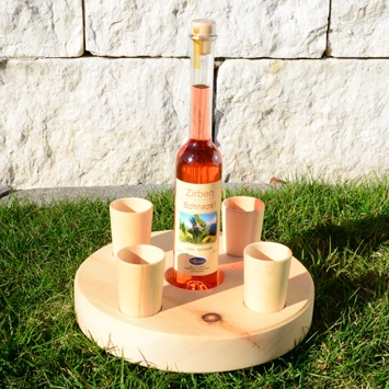 Für gesellige Runden ideal: 4 Stamperl aus Zirbenholz auf einem Zirbentablett. In der Mitte ist Platz für eine Flasche Schnaps. Für einen sicheren Stand sorgen Vertiefungen für Stamperl und Flasche.